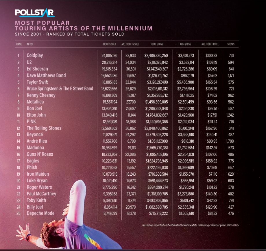 Pollstar представи 25-те най-популярни гастролиращи изпълнители на новото хилядолетие, като на първо и вторo място в класацията са Coldplay и U2. Топ 5 се допълва от Ed Sheeran, Dave Matthews Band и Taylor Swift, която е единствената жена в Топ 10. След нея се нареждат Bruce Springsteen и The E Street Band, Kenny Chesney, Metallica, Bon Jovi и Elton John.