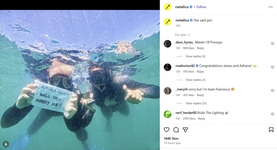 В официалния канал на Metallica в Instagram кадърът също бе споделен, придружен от думите „Тя каза „да!““