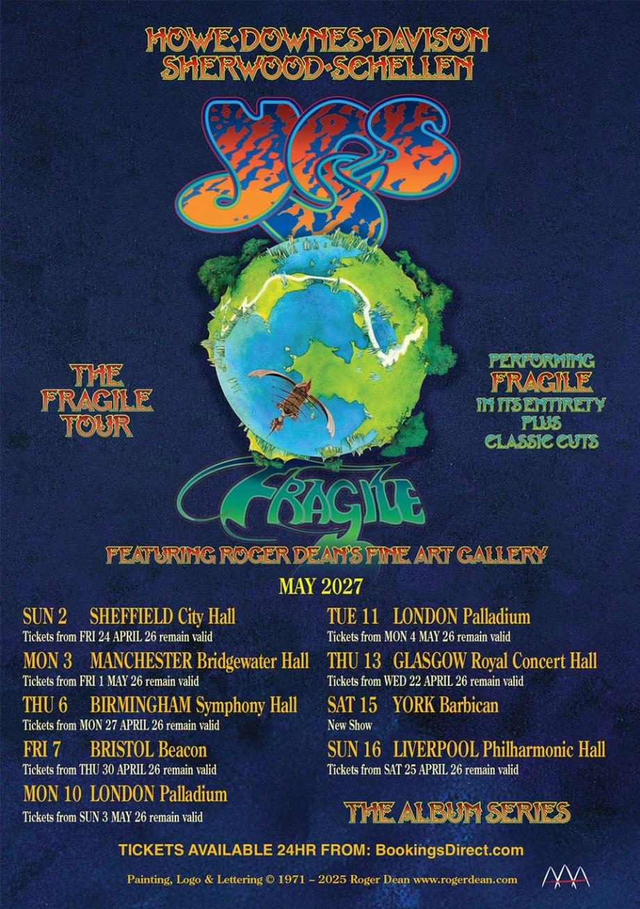 Yes обявиха пренасрочените дати за турнето си Fragile на Острова, кръстено на четвъртия им албум. Първоначално планирани да започнат на 22 април, прогресив рок бандата отложи концертите в началото на този месец, тъй като китаристът Steve Howe трябваше да се подложи на важна операция, изискваща време за възстановяване. Сега групата потвърди, че обиколката ще се проведе през май 2027 г.